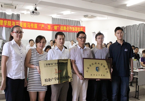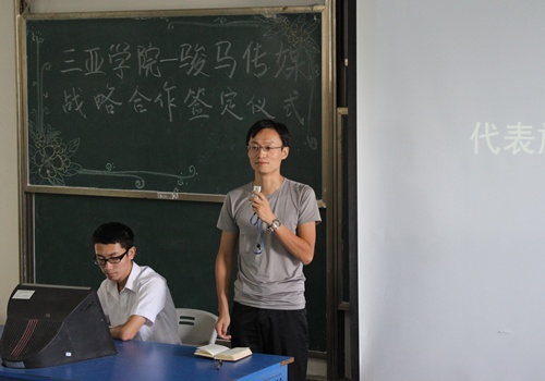 仪式首先由我院王院长代表学院致欢迎词。王院长在致辞中表示,校企合作势必推动各专业方面的发展,此次与骏马传媒的合作,将成为诸多合作的良好开端。在建立起良好合作关系之后,我院实习实训将向着模范化、机制化、科学化发展,并且为学生提供更多的实习实训机会和更广阔的平台。我院将抓住校企合作这一机遇,与社会企业促进联合发展。同时,相信在双方的共同努力下,一定能为三亚乃至海南旅游业的发展做出自己的贡献。