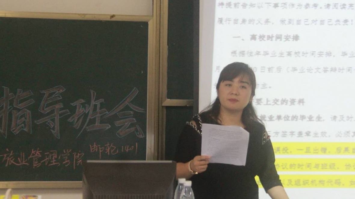 10月17日下午七点,我院18届邮轮1401和会展1401全体学生于书知楼2201教室召开了毕业生指导班会,由思想导师石玲老师就毕业生承诺书填写信息以及就业状况等内容进行讲述。