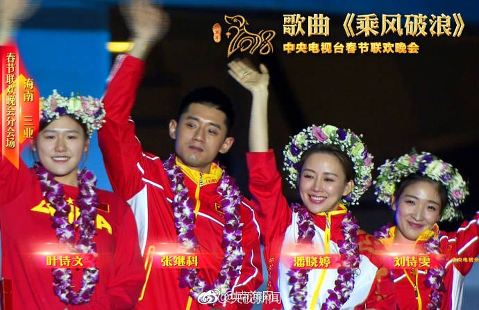 冯巩的一句“我想死你们了”,勾起了多少人的回忆也增加了狗年春晚的年味。今年他一改往年小品的表现形式,转向相声,与贾旭明、曹随风、侯林林三位诗歌发烧友一起赛诗,迷你版诗词大会呈现出了别样精彩。 一曲《乘风破浪》唱出中华儿女的激情与豪迈,张继科、叶诗文、傅园慧、惠若琪、冯珊珊、柯洁更是齐现海南三亚分会场。