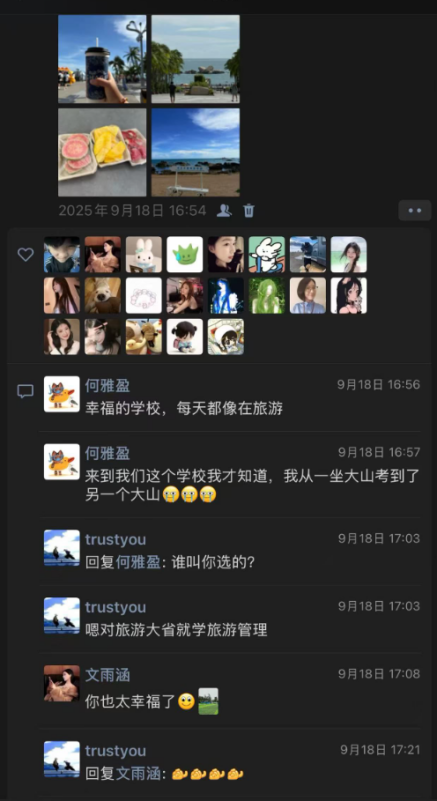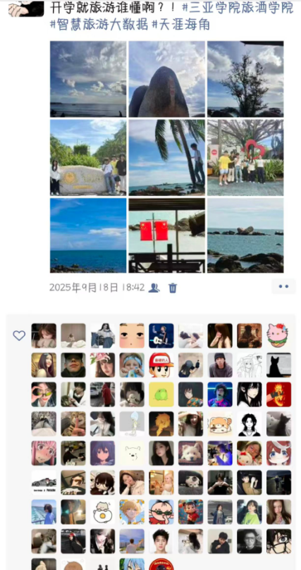 旅游行业龙头鼎力支持: 本次活动获得了海南省旅游行业的高度关注与认可。三亚旅发集团、大小洞天旅游区、天涯海角游览区等业内企业纷纷转发本次认知实习的创作成果,并公开赞赏这种开学旅行式教学走在了前列,为学生提供了宝贵的行业初体验。”